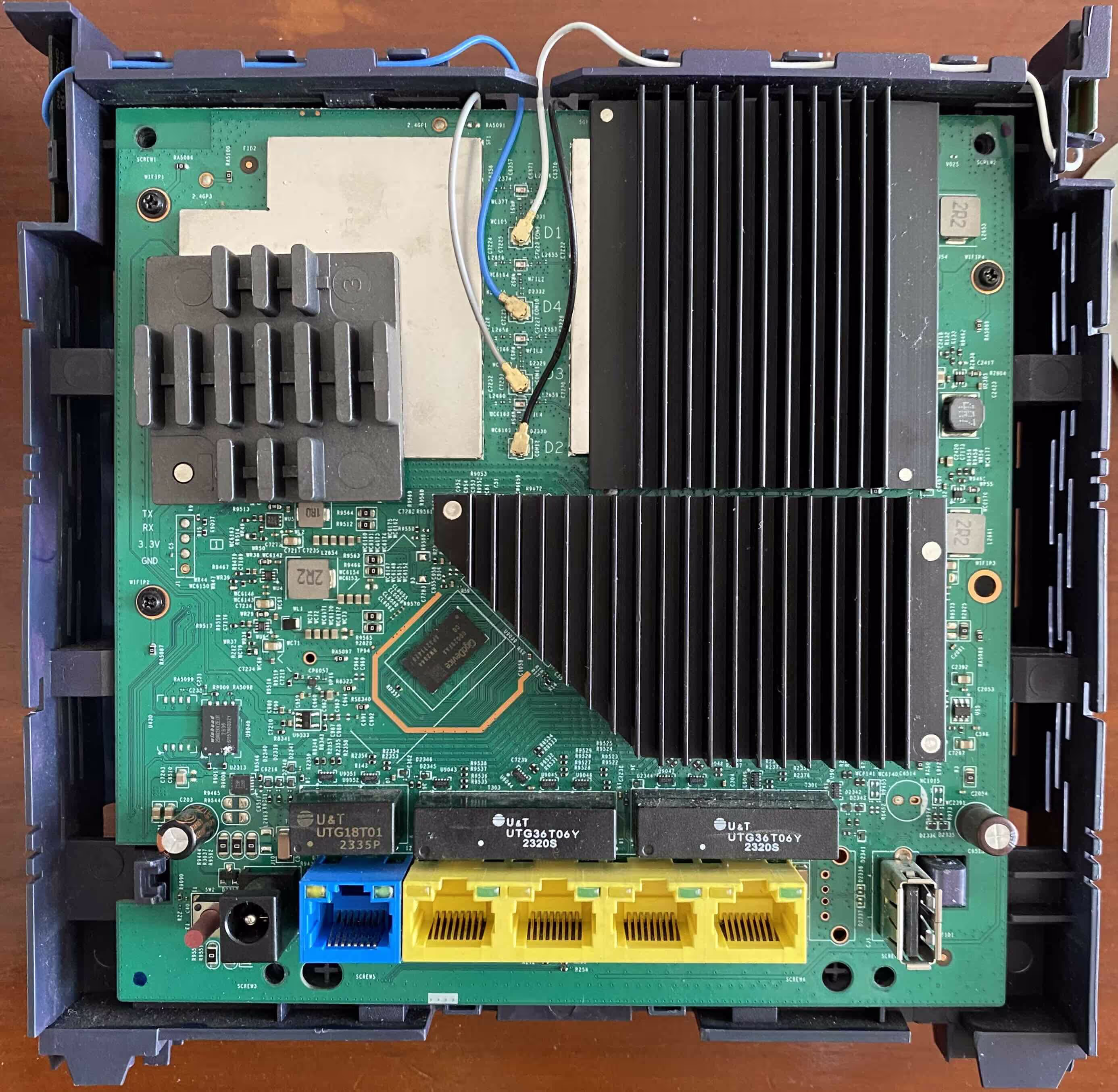 As always, the first step is reconnaissance; I had to understand the platform. A physical teardown of the router shows that it has a MediaTek MTK7986 (Filogic 830) SoC, whose reference boards are compatible with OpenWrt 24.10.x, so I downloaded the OpenWrt initramfs-kernel image.